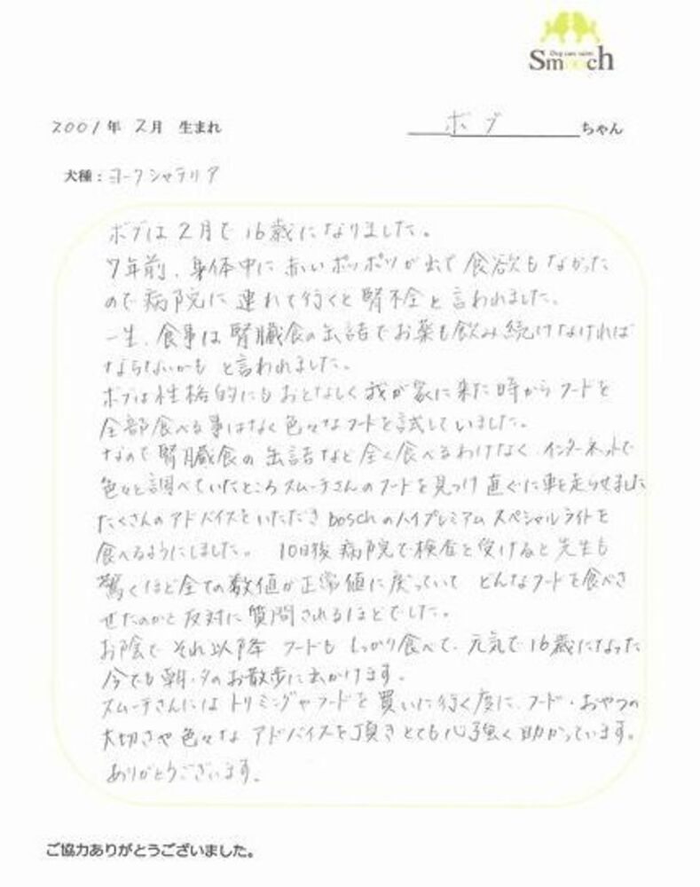 ヨークシャテリアのボブくんママからいただいたお声です。